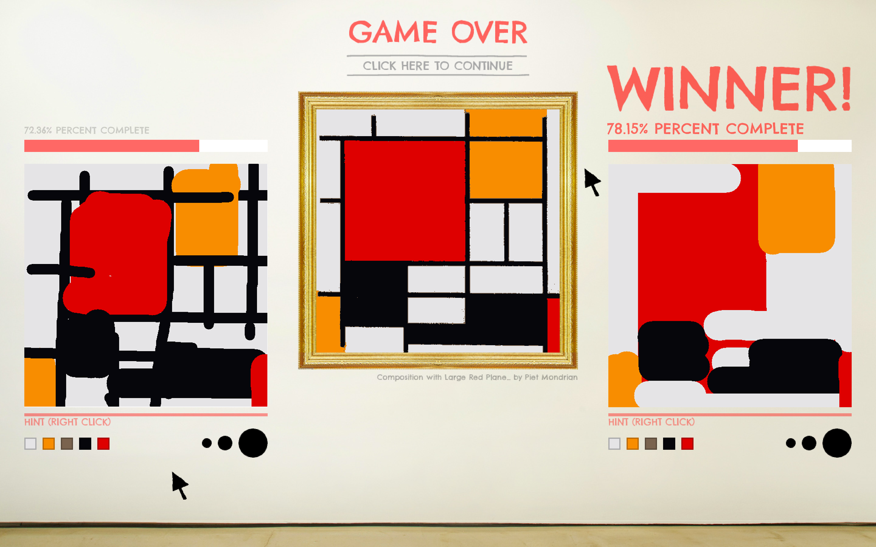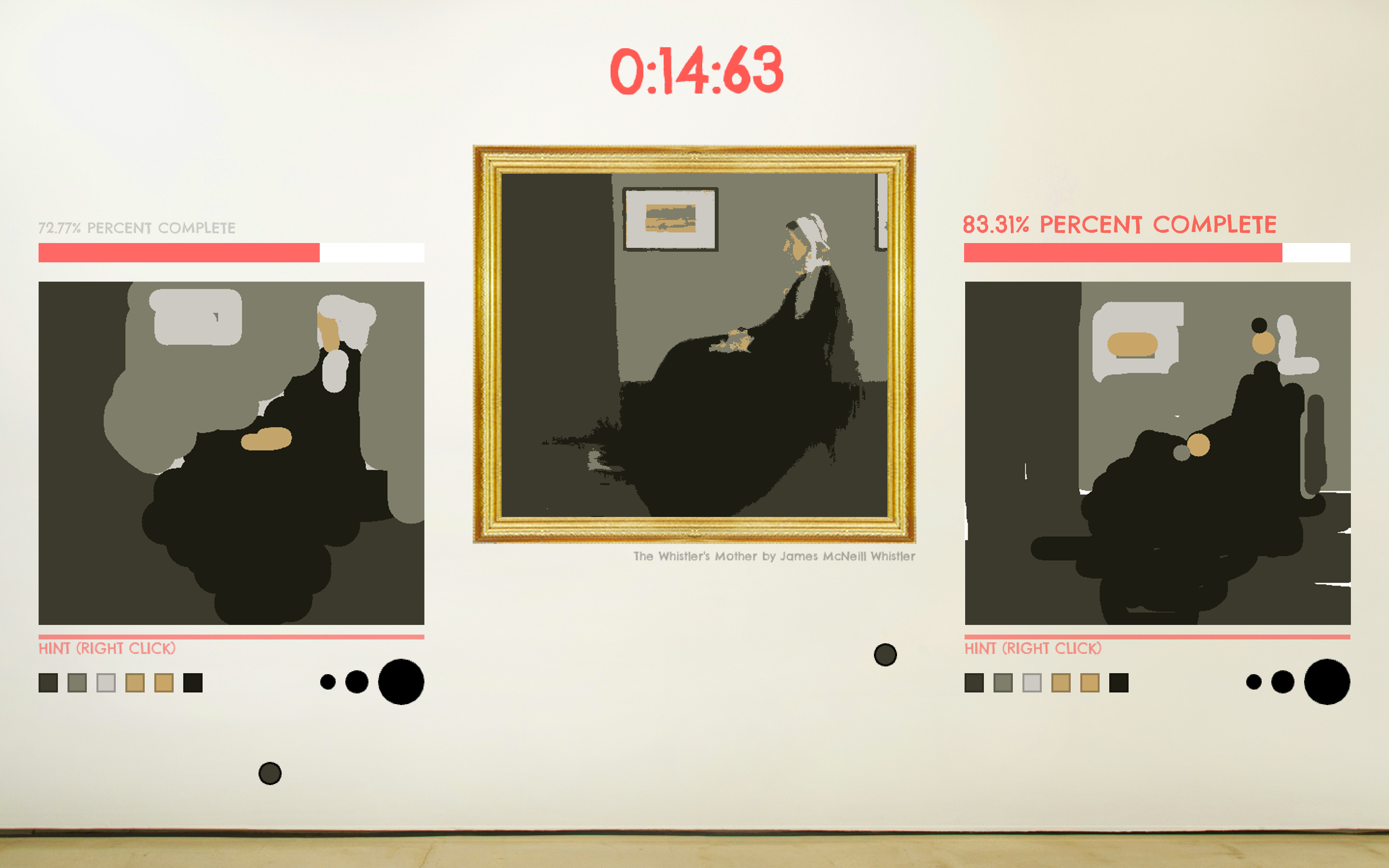 Sloppy Forgeries is a fast-paced, two-player local multiplayer painting game. Each player is given a mouse, a blank canvas, and a few simple paint tools. Each round, a famous painting from art history is revealed. Players race to copy the painting as quickly and accurately as possible.